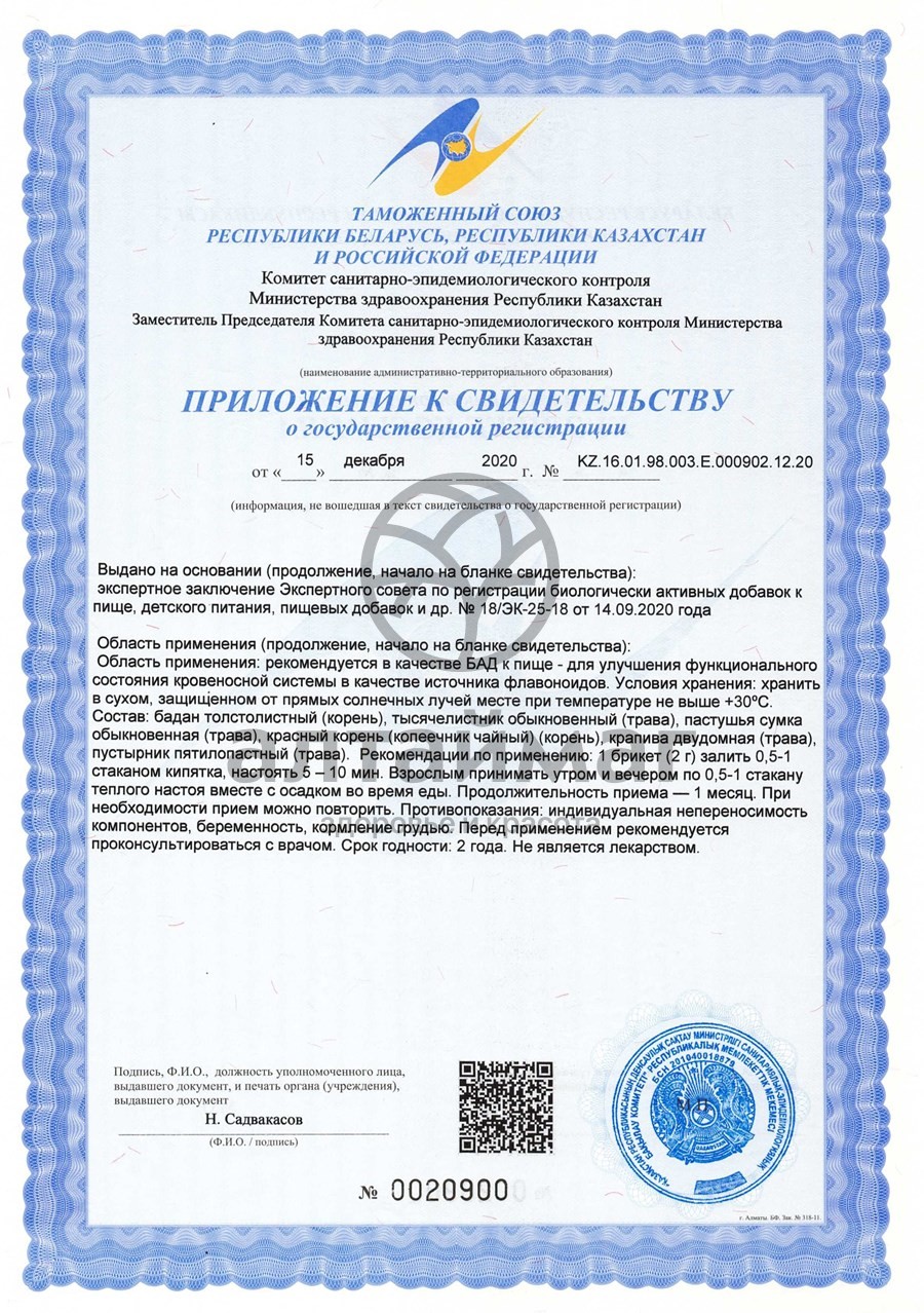 Утренний: тысячелистник обыкновенный, бадан толстолистный, копеечник чайный (красный корень), крапива двудомная, пастушья сумка. Вечерний: тысячелистник обыкновенный, бадан толстолистный (корень), копеечник чайный (красный корень), крапива двудомная, пастушья сумка, пустырник пятилопастный.