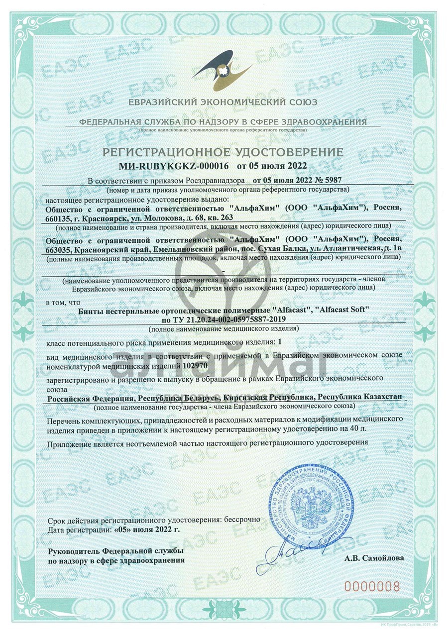 Бинт нестерильный ортопедический полимерный Alfacast Sort (Альфакаст Софт) - современная альтернатива гипсовой повязке. Предназначен для изготовления фиксирующих повязок при иммобилизации переломов, вывихов, травмированных суставов, поврежденных связок опорно-двигательного аппарата, при ортопедических заболеваниях и после травматолого-ортопедических операций. Применяется в качестве иммобилизирующего и ортезирующего средства. Бинты изготовляются из трикотажных полиэстеровых нитей, пропитанных специальной клеевой композицией на основе полиуретана.