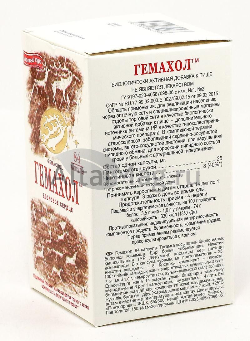 Гемахол - надежный и безопасный природный препарат, созданный для сохранения здоровья сердечнососудистой системы. После полного курса приема Гемахола происходит снижение холестерина на 30\%, и положительные изменения сохраняются в течение 3-х месяцев. Эффективно очищает кровеносную систему от скоплений холестерина и тормозит развитие главного недуга пожилых людей - атеросклероза, снижая вероятность возникновения инфарктов и инсультов. Улучшает обмен веществ и кровоснабжение всех органов и тканей в организме. Гемахол уменьшает размеры имеющихся атеросклеротических бляшек и увеличивает просвет сосудов. Полностью удовлетворяет суточную потребность организма в никотиновой кислоте (витамин РР).