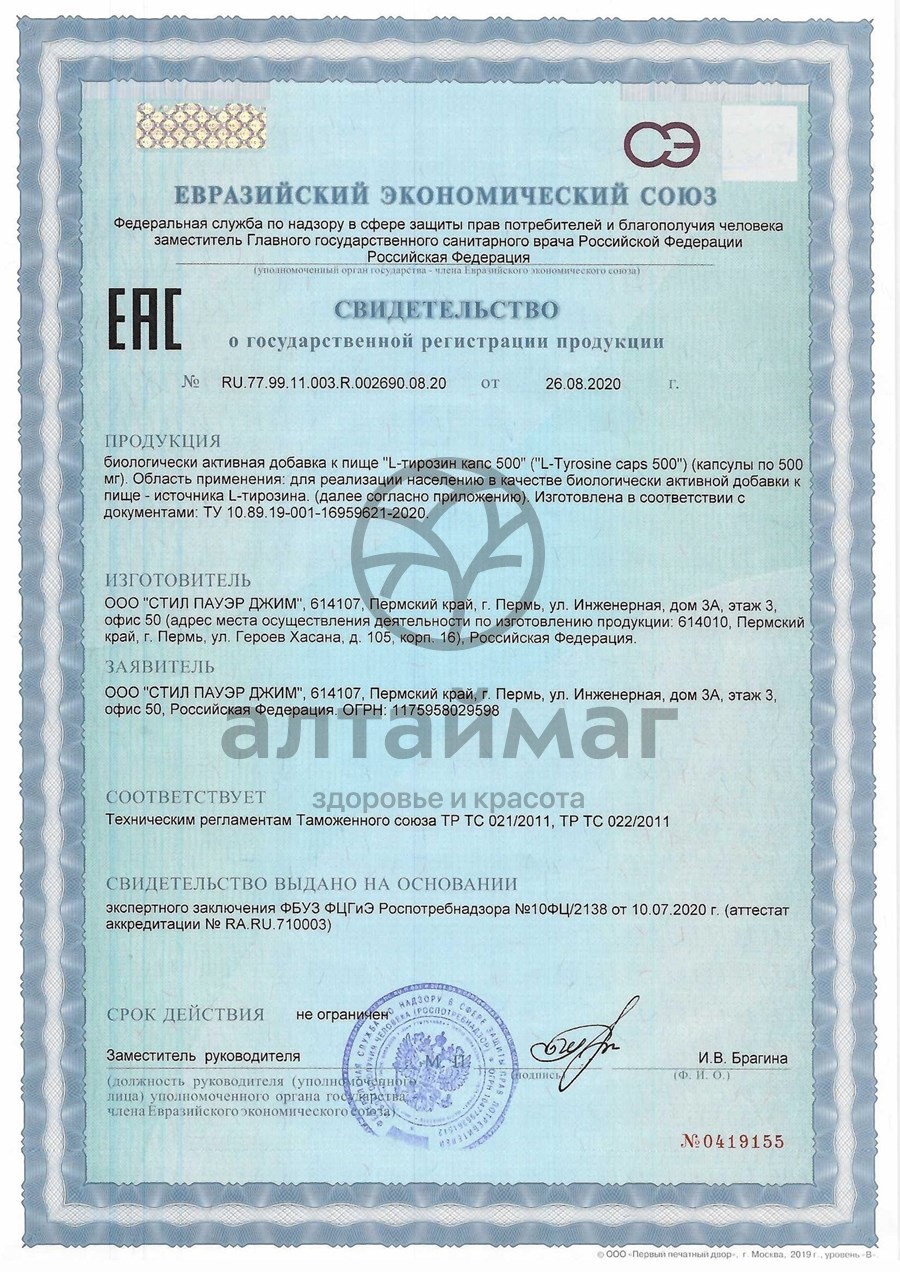 Аминокислота L-тирозин относится к заменимым, так как вырабатывается в каждой клетке нашего тела. Тирозин необходим для построения молекул белка во всех тканях, входит в состав ферментов.
