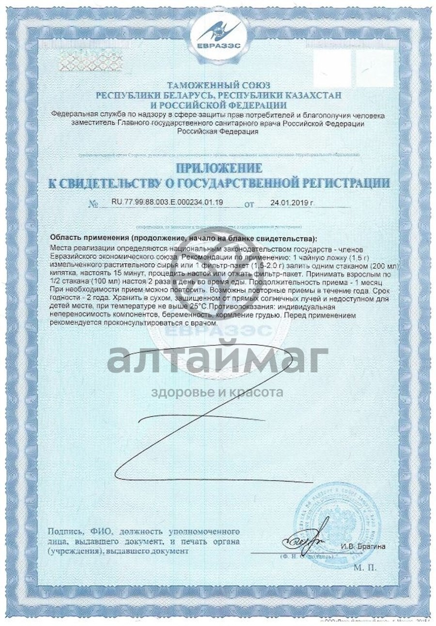 1 фильтр-пакет залить 1 стаканом (200 мл) кипящей воды, настоять 10-15 минут, процедить, отжать. Взрослым принимать по 1/2 стакана 2 раза в день во время еды. Перед применением проконсультироваться с врачом.Назначение
