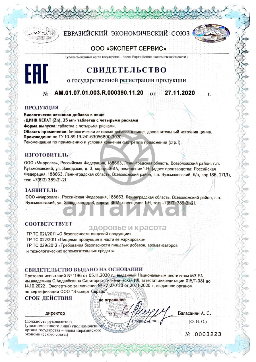 - МИРРОЛЛА ЦИНК ХЕЛАТ (ZN) 25МГ - Биологически активная добавка (БАД) к пище