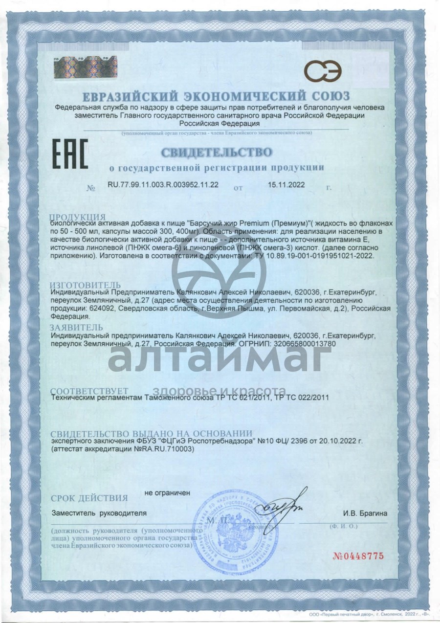 100% барсучий жир. Рекомендуется в качестве дополнительного источника полиненасыщенных жирных кислот, в том числе омега 3.